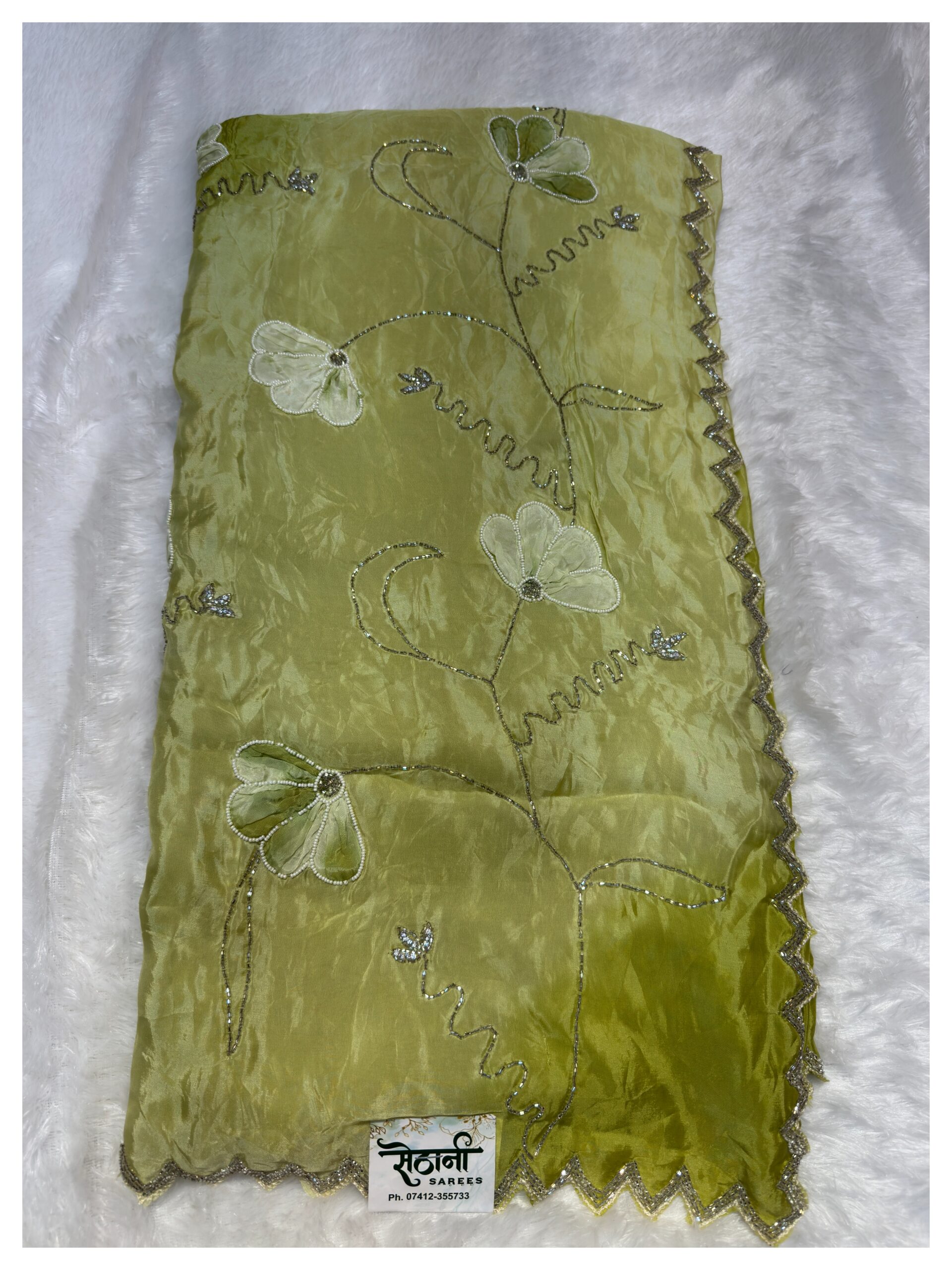 Work / Pattern: Fine Cutdana bead work combined with Moti hand embroidery and festive border detailing